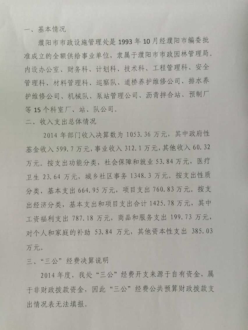 濮阳市市政设施管理处成立于1993年10月,事业性质,科级单位,科级领导职数4名,核定编30名,纳入人事计划管理103人,经费由市财政全额供给;另有临时人员108人,合计实有人员211人。内设办公室、财务科、计划科、技术科、工程科、安全科、材料科、市政监察中队、排水养护公司、道桥养护公司、机械化作业公司、泵站管理公司等12个科室队公司。